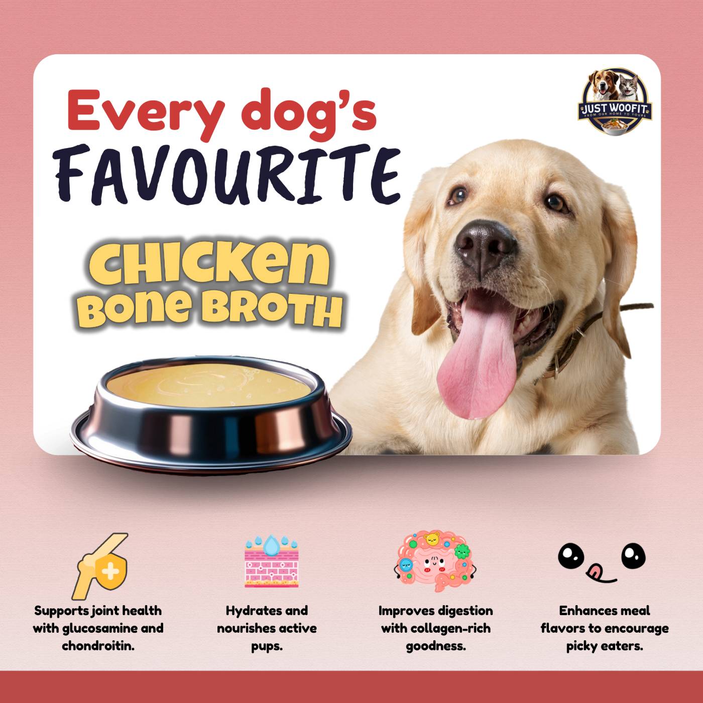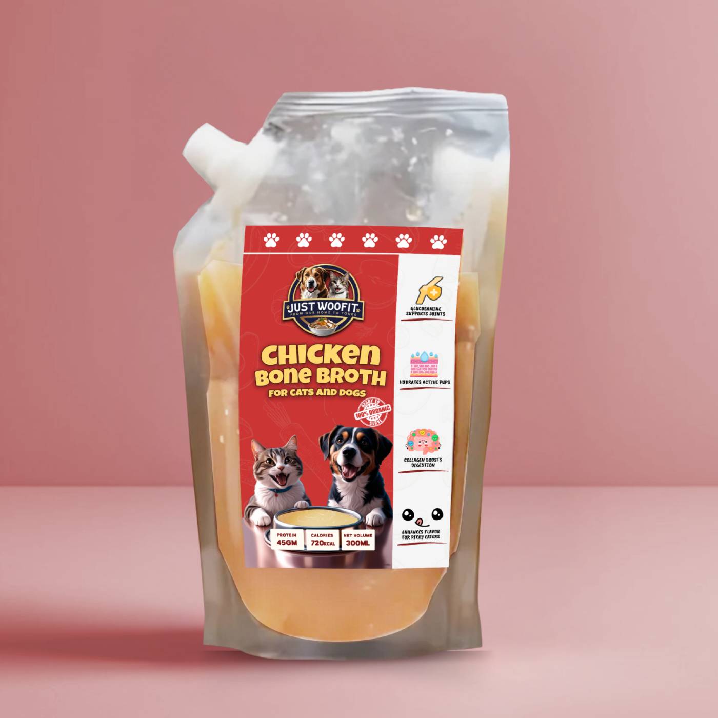 Our chicken broth for dogs is a clean, transparent, and nourishing supplement. It’s ideal for daily use, especially during hot weather, recovery periods, or to support aging joints. Every sip is packed with real nutrients—no shortcuts, no nonsense.